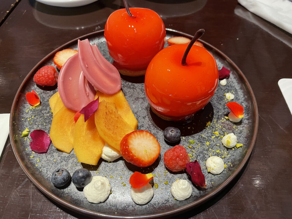 一番上のプレートは、リンゴのムースショコラ・フルーツ添え。