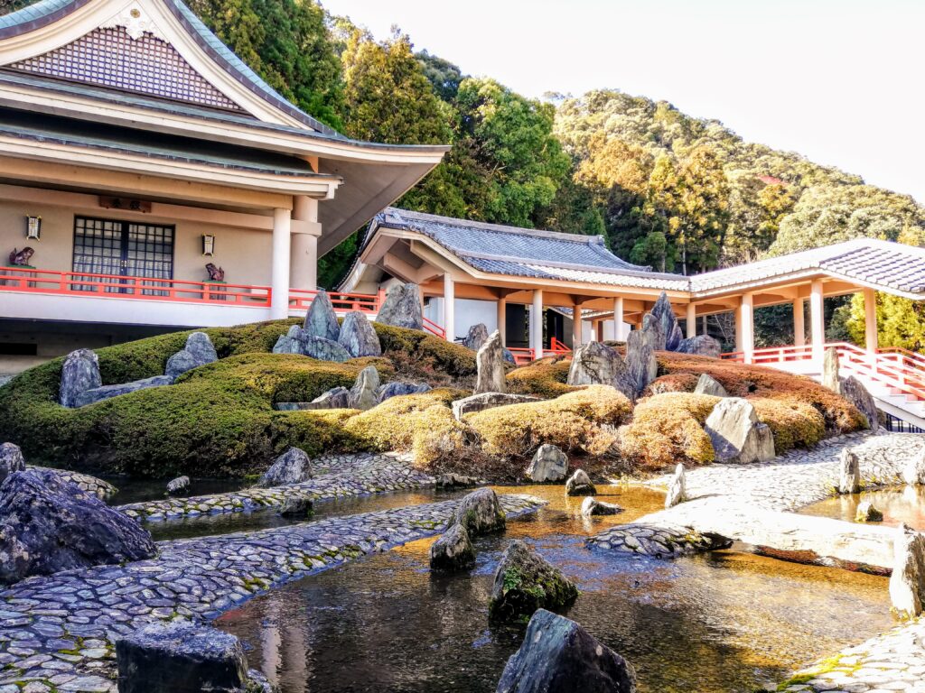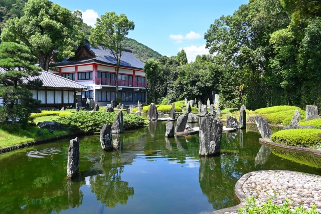 他の神社仏閣の庭園とは違ったテイストの岩が特徴の庭園。