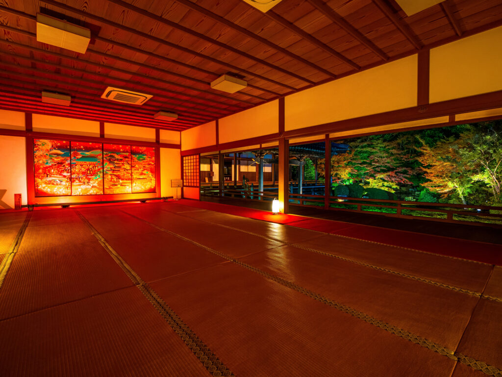秋の紅葉時期にはライトアップが行われます。庭園と襖絵のコントラストが美しいですね。