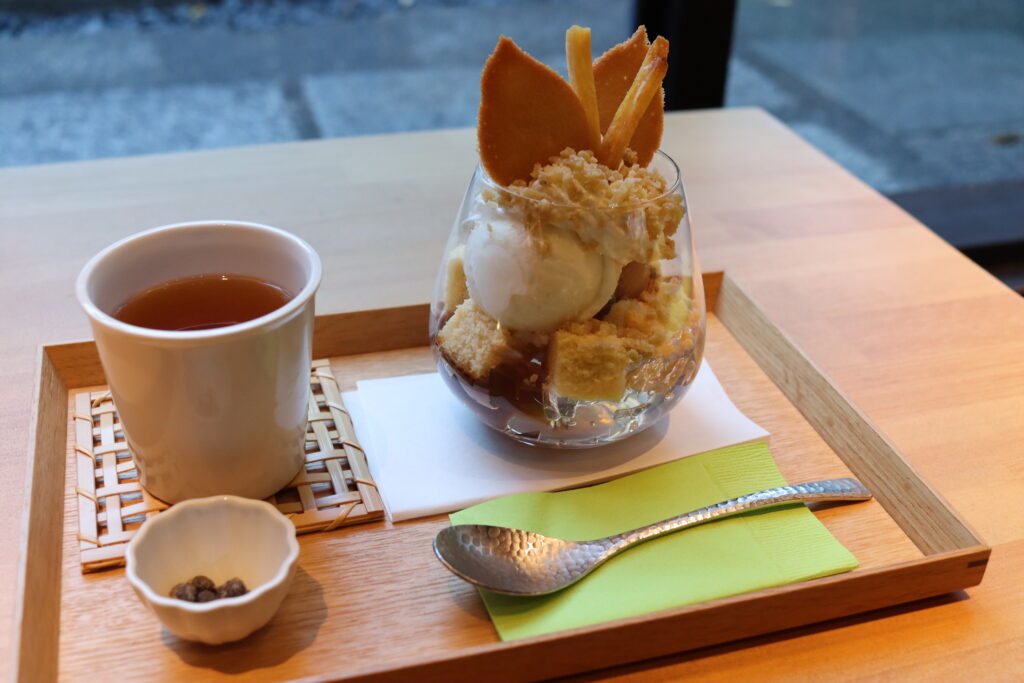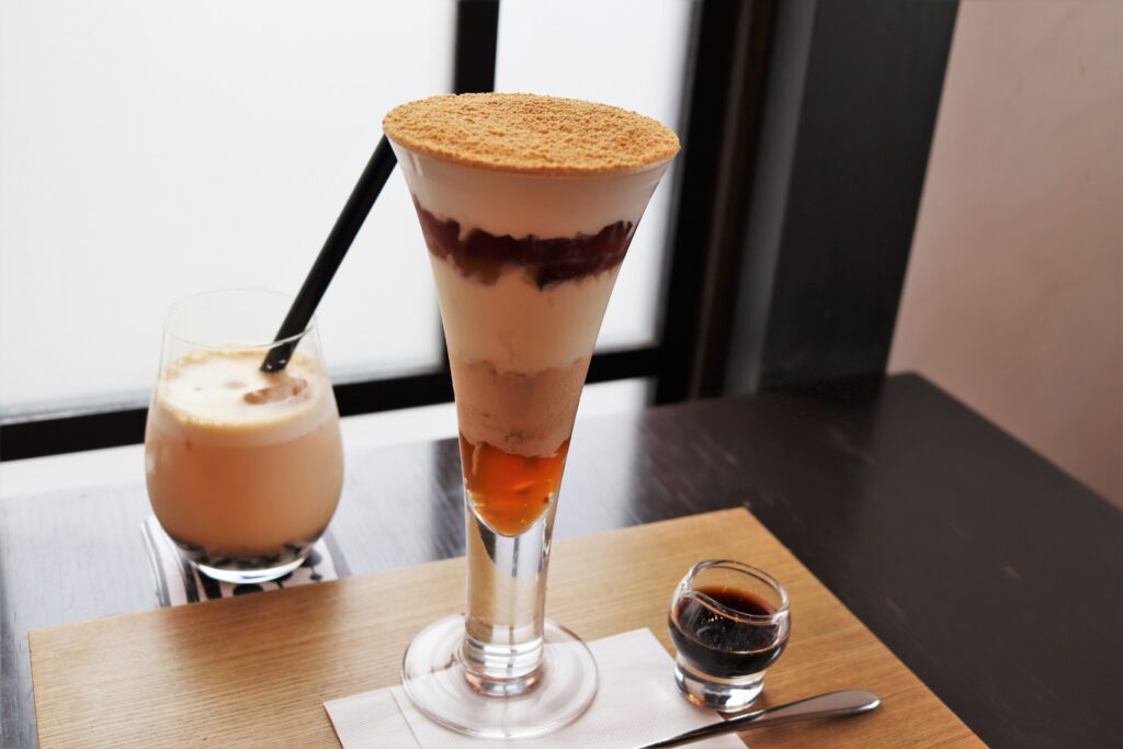 香ばしいきな粉の香りと黒蜜の相性がばつぐんの焦がしきな粉パフェ。