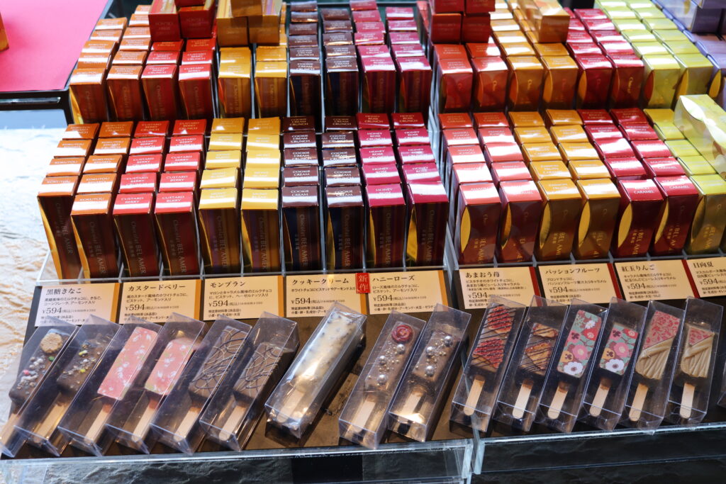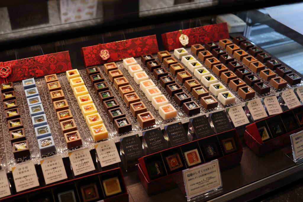 1階はお土産屋さんになっていて、和柄やきらきらのスティックショコラ、枡に見立てたショコラの中にジュレが入っているなど、とってもかわいいショコラをいくつも取り揃えられています。