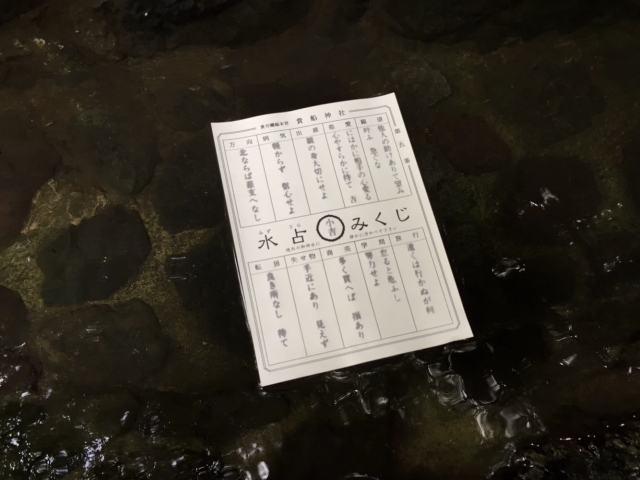 貴船山の湧き水であるご神水に浮かべると占い結果が浮き上がってくる「水占みくじ」も人気。