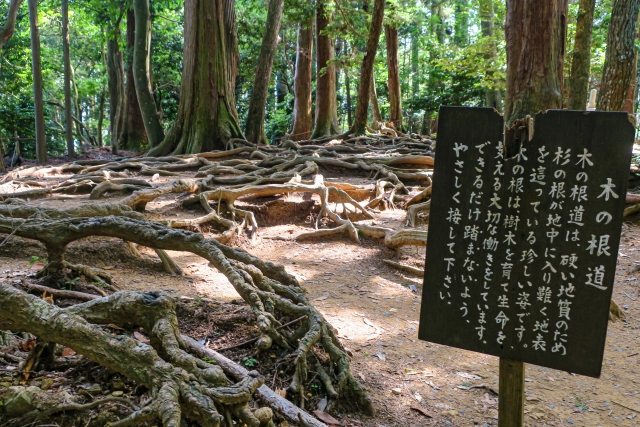 木の根道は、この辺り一帯の砂岩が、灼熱のマグマの貫入によって硬化したために根が地下に伸びることが出来なかったため、このように珍しい根のはり方をしているそうです。