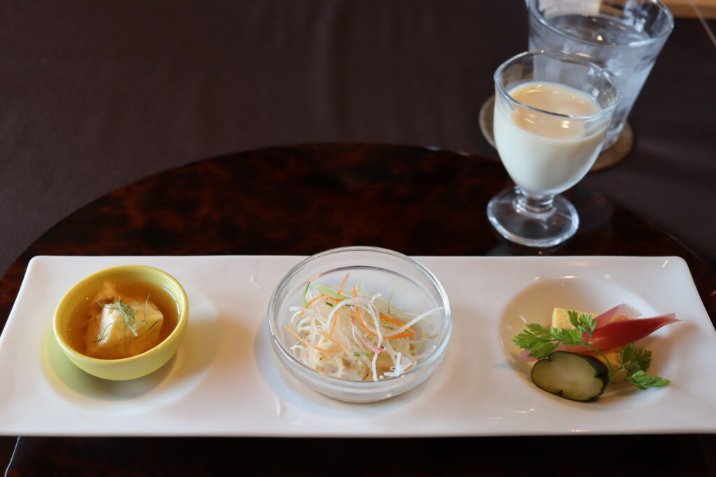 ゆばのすり流しスープと前菜。今回は「Bコース」¥3,300を注文。