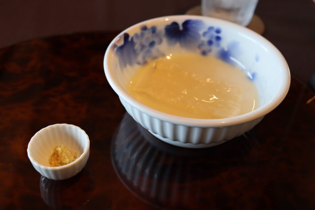 あたたかい汲み上げ湯葉。ショウガと割醬油でいただきます。