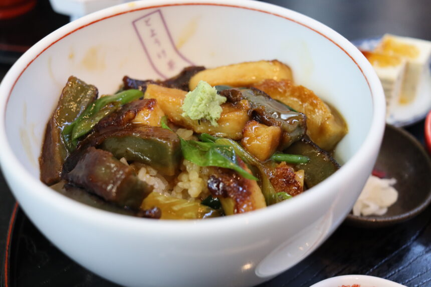 もちもち食感の生麩を甘辛だれとわさびでいただく「生ふ丼」。